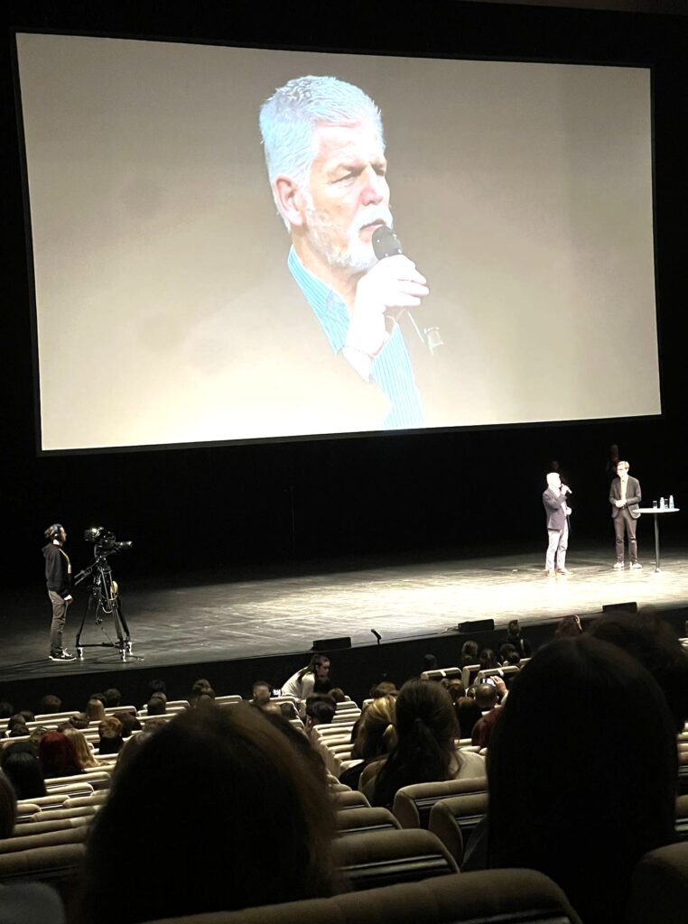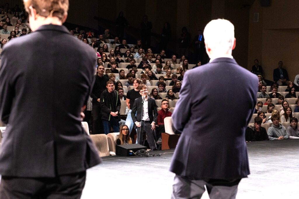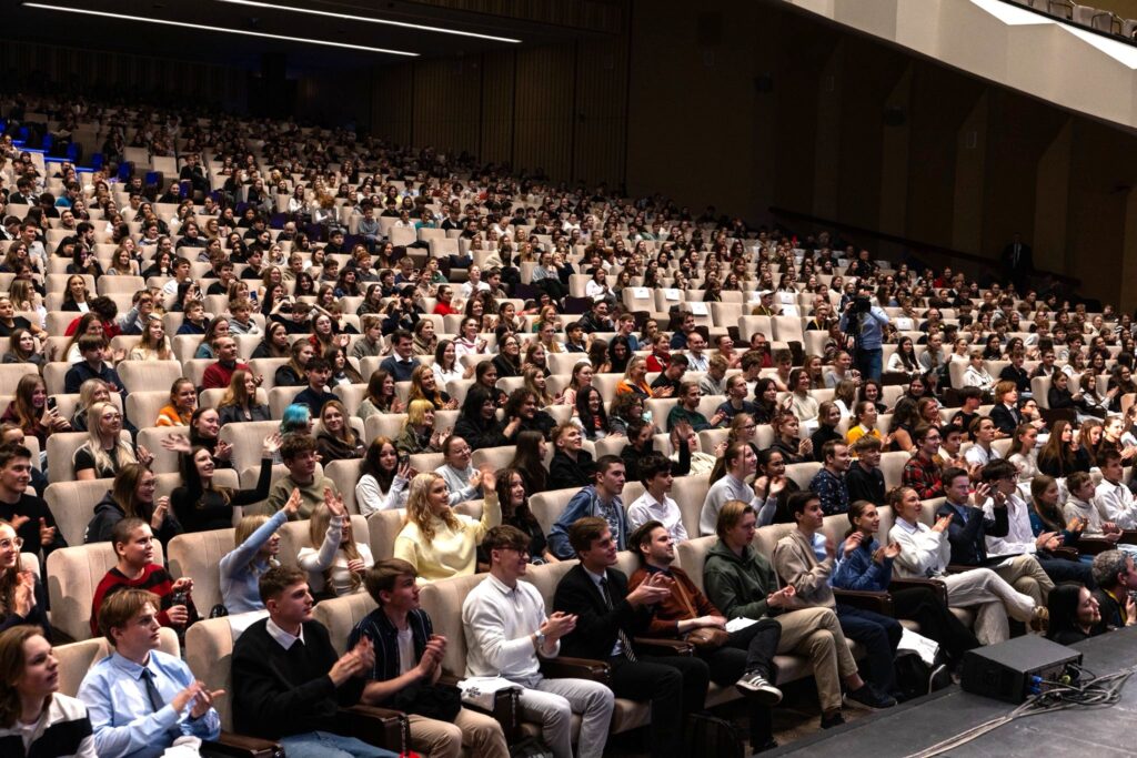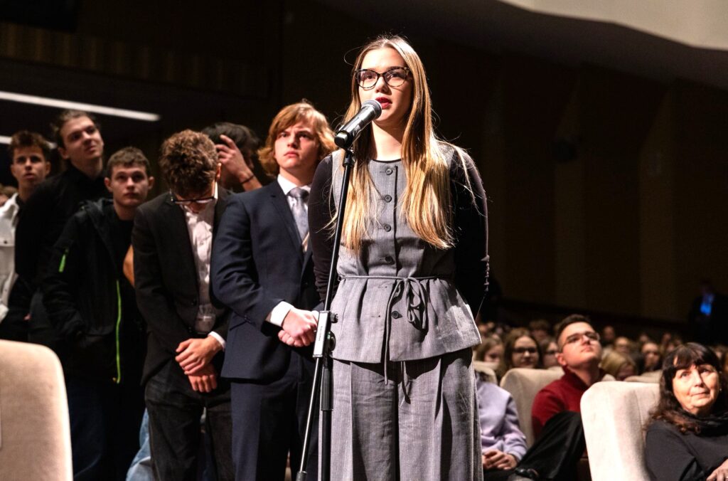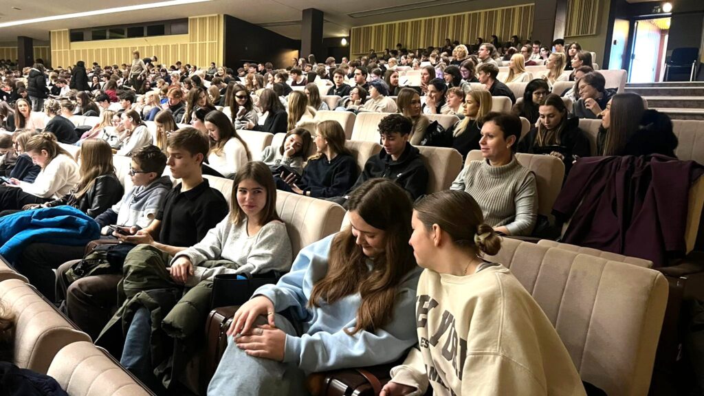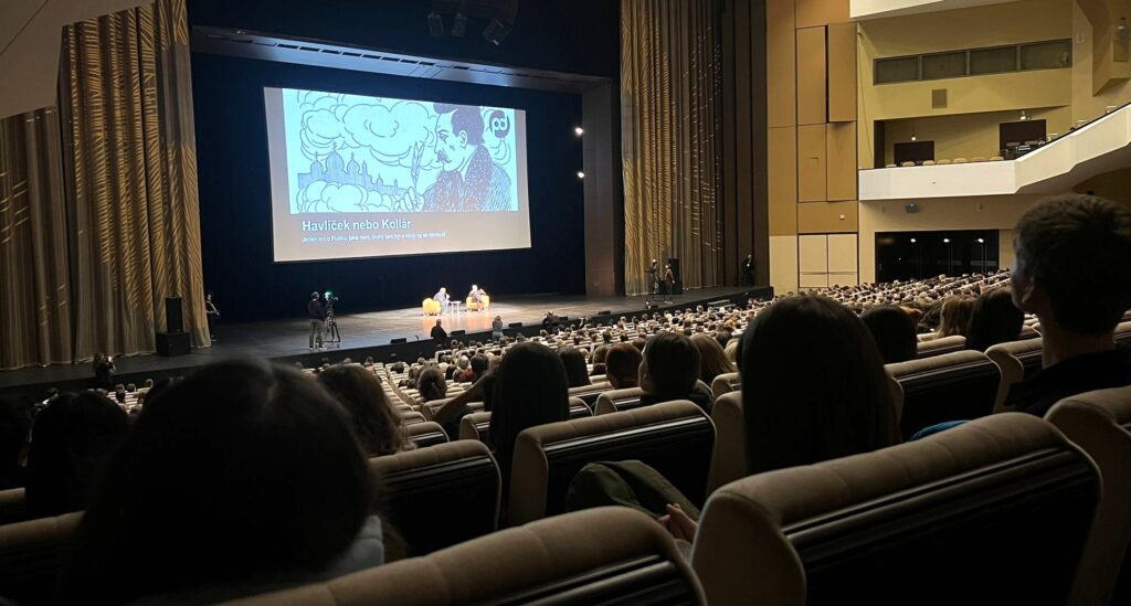 Poslední týden před Vánoci jsme s třídou 1.LY vyrazili do Prahy. Spolu s více než třemi tisíci dalších středoškoláků z celé republiky jsme se účastnili projekce filmu Velký vlastenecký výlet a následné diskuze s autory filmu, historiky z podcastu Přepište dějiny, válečnou zpravodajkou na Ukrajině Darjou Stomatovou a také prezidentem republiky Petrem Pavlem.